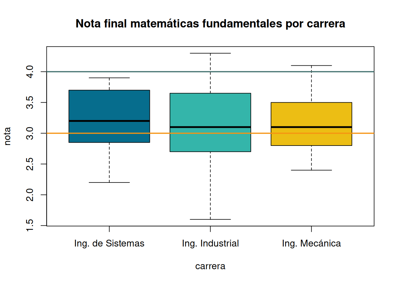 col=c("#066d8d","#34b5aa","#ecbe14"), names=labs, xlab = "carrera", ylab = "nota")