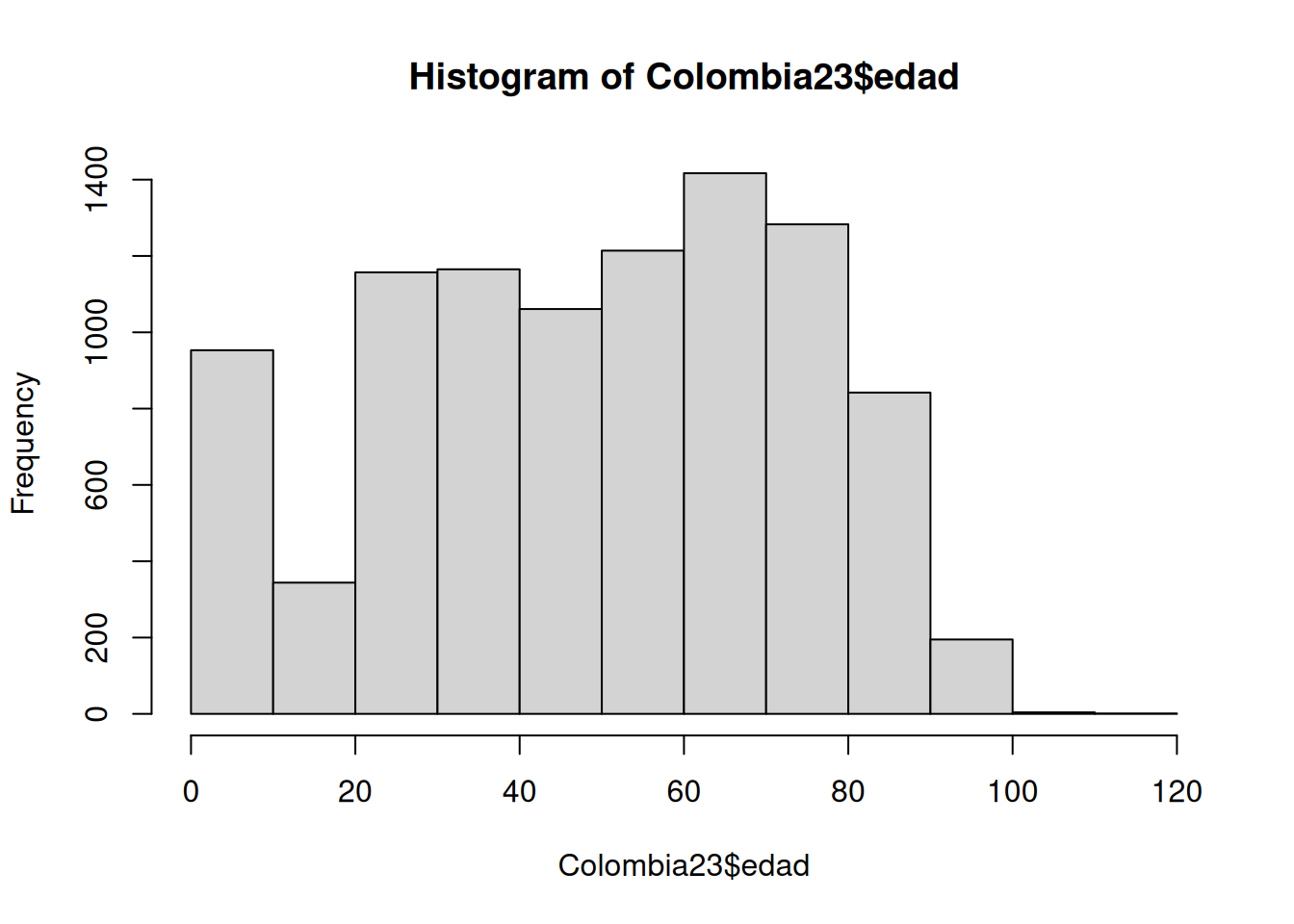 Colombia23$edadR[Colombia23$edad>59]="6. (Más de 59 años]"