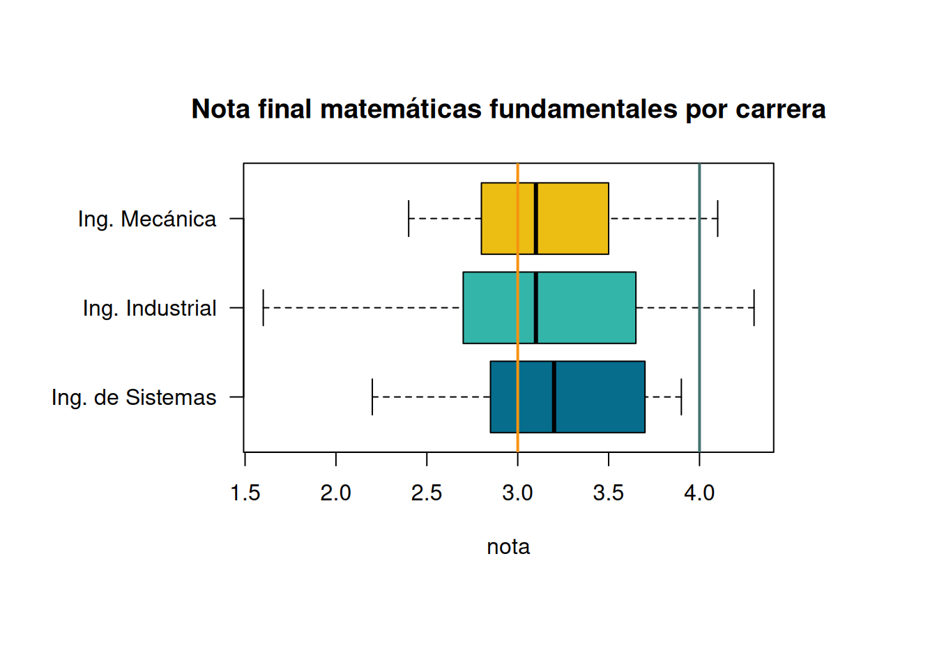 boxplot((nf~cc),main="Nota final matemáticas fundamentales por carrera",
