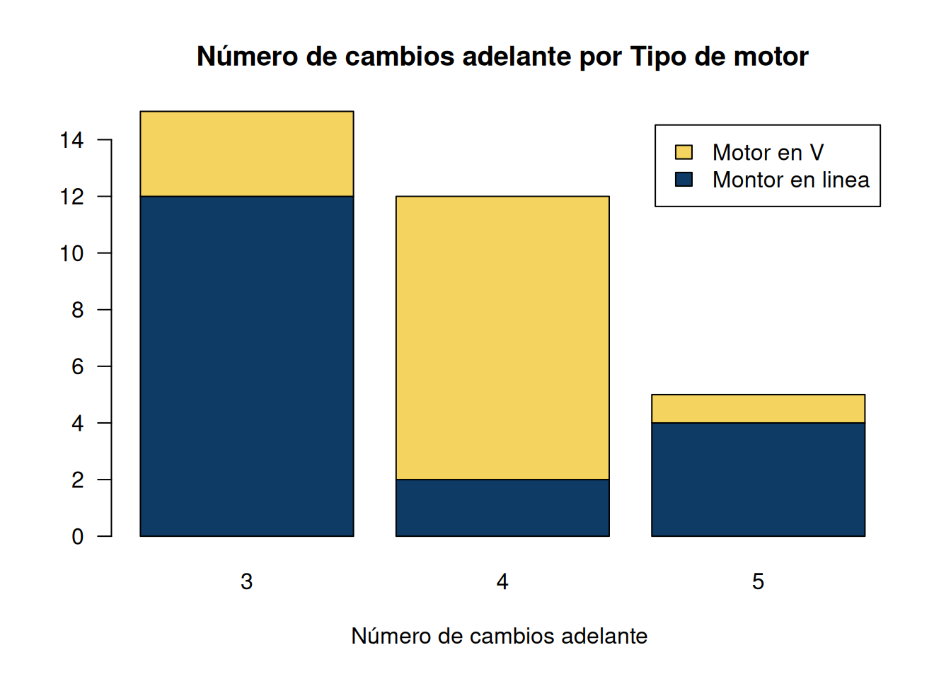 barplot(counts, main="Número de cambios adelante por Tipo de motor",