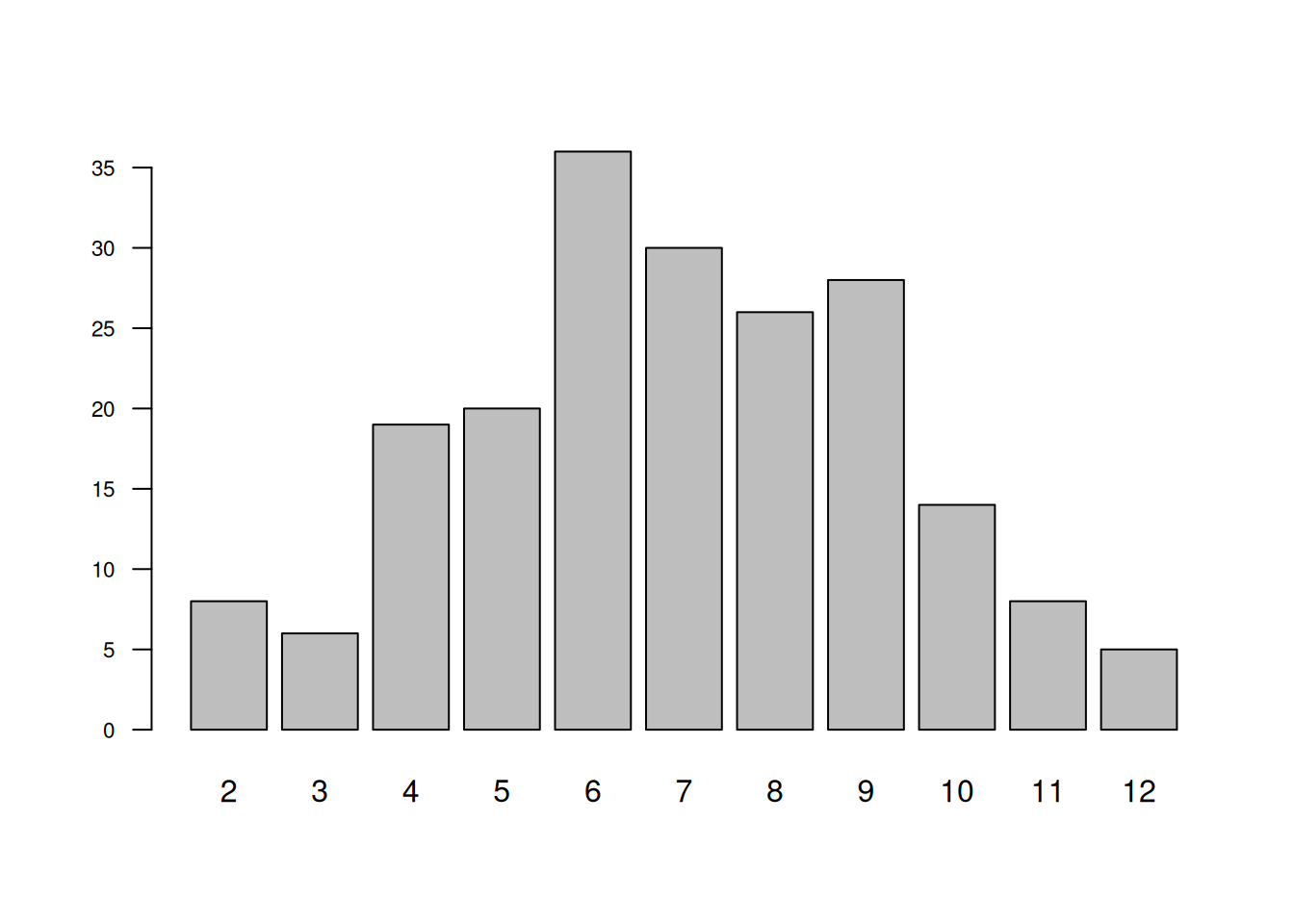 t=sapply(1:200, function(x){sum(sample(1:6,2,rep=T))})