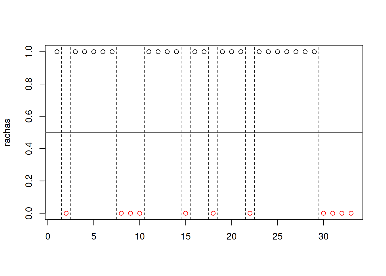 runs.test(rachas,alternative = "left.sided",threshold = 0.5,pvalue = "exact",plot=F)