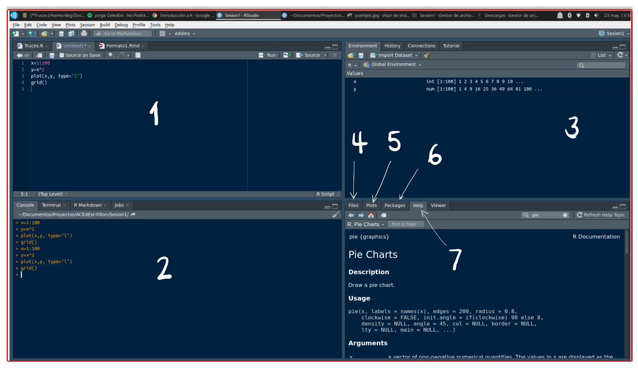 Podemos usar este lenguaje utilizando una terminal o mediante la IDE RStudio, la cual integra un conjunto de herramientas que facilitan el uso R a los usuarios