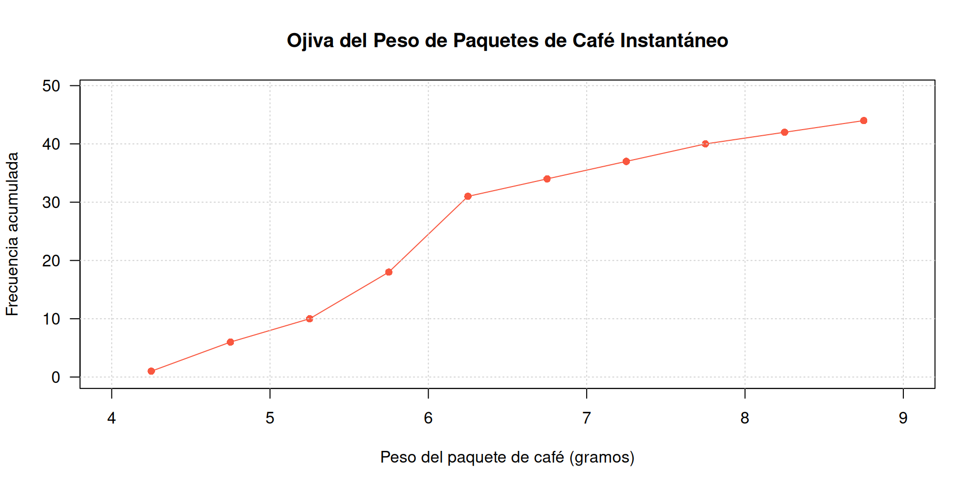 xlab = "Peso del paquete de café (gramos)", ylab = "Frecuencia acumulada",