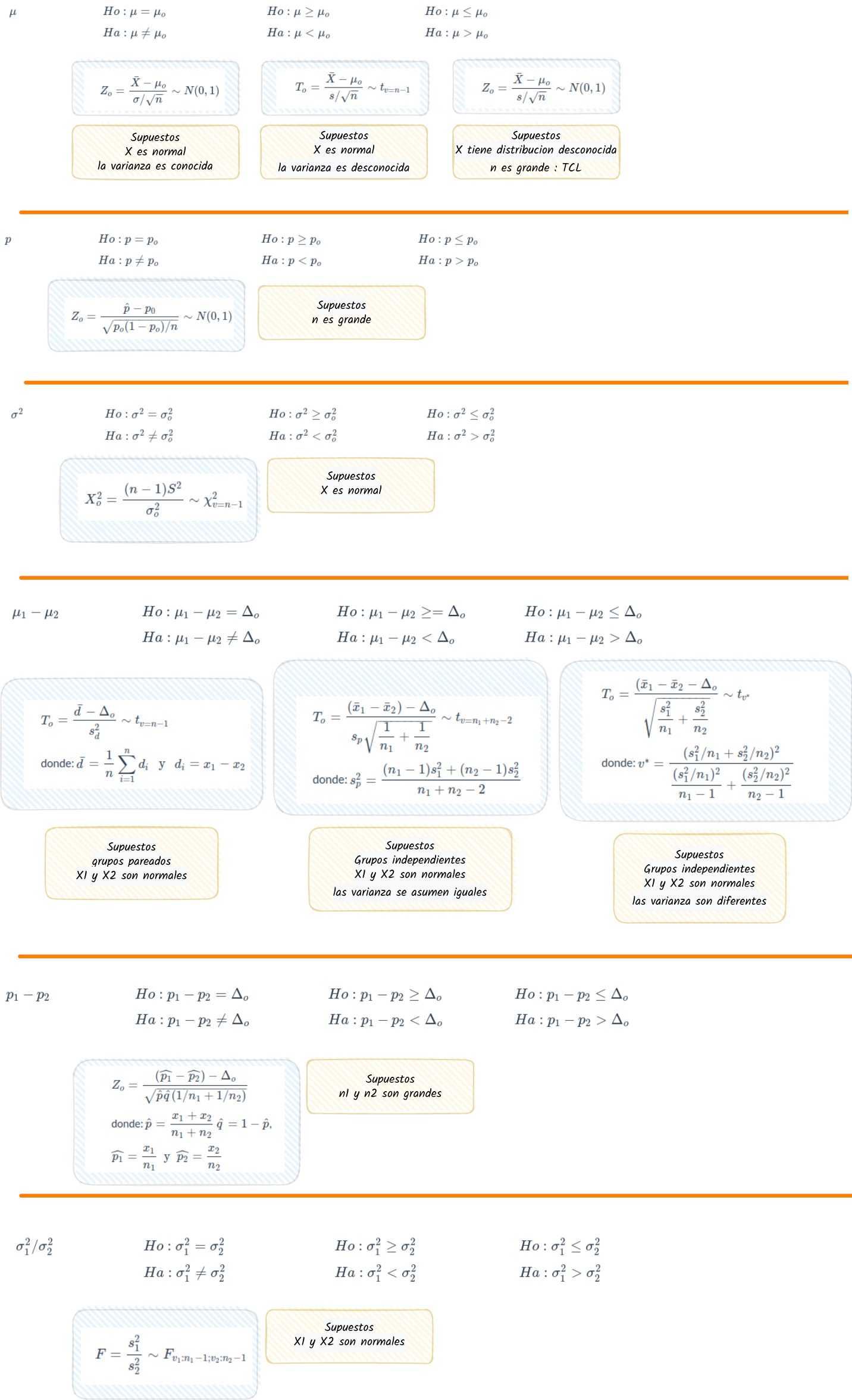 | proporción | \[IC_{p}: \widehat{p} \pm z_{\alpha/2} \hspace{.1cm}\sqrt{\frac{\widehat{p}(1-\widehat{p})}{n}}\] | (7) |