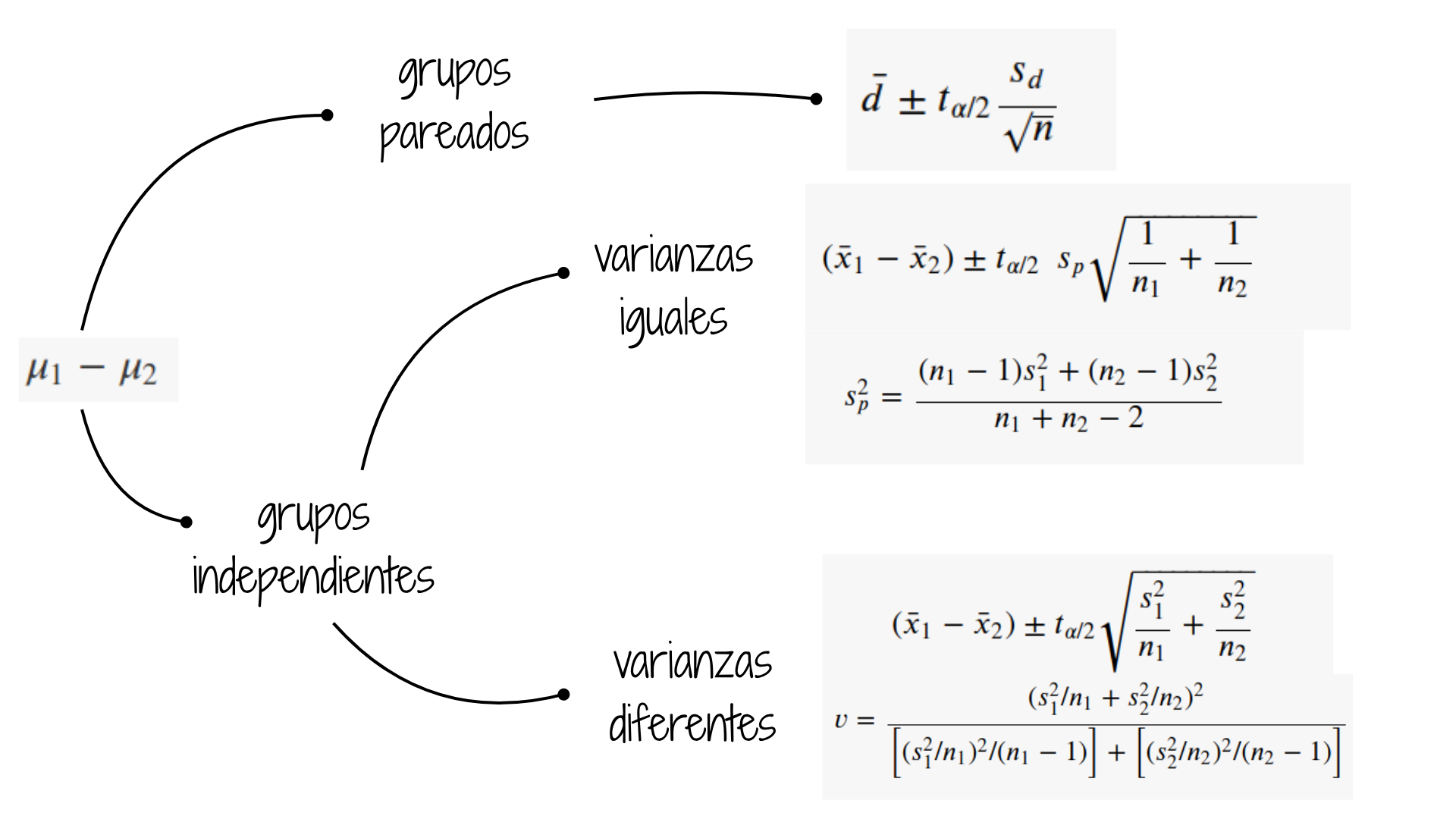 | (8) | \((\bar{x_{1}}-\bar{x_{2}})\pm t_{\alpha/2, v^{*}} \sqrt{\frac{s_{1}^{2}}{n_{1}}+\frac{s_{2}^{2}}{n_{2}}}\) | Grupos independientes,\(X_{1}\sim norm(\mu_{1}\), \(\sigma^{2}_{1})\), \(X_{2}\sim norm(\mu_{2}, \sigma_{2}^{2})\), varianzas diferentes | |