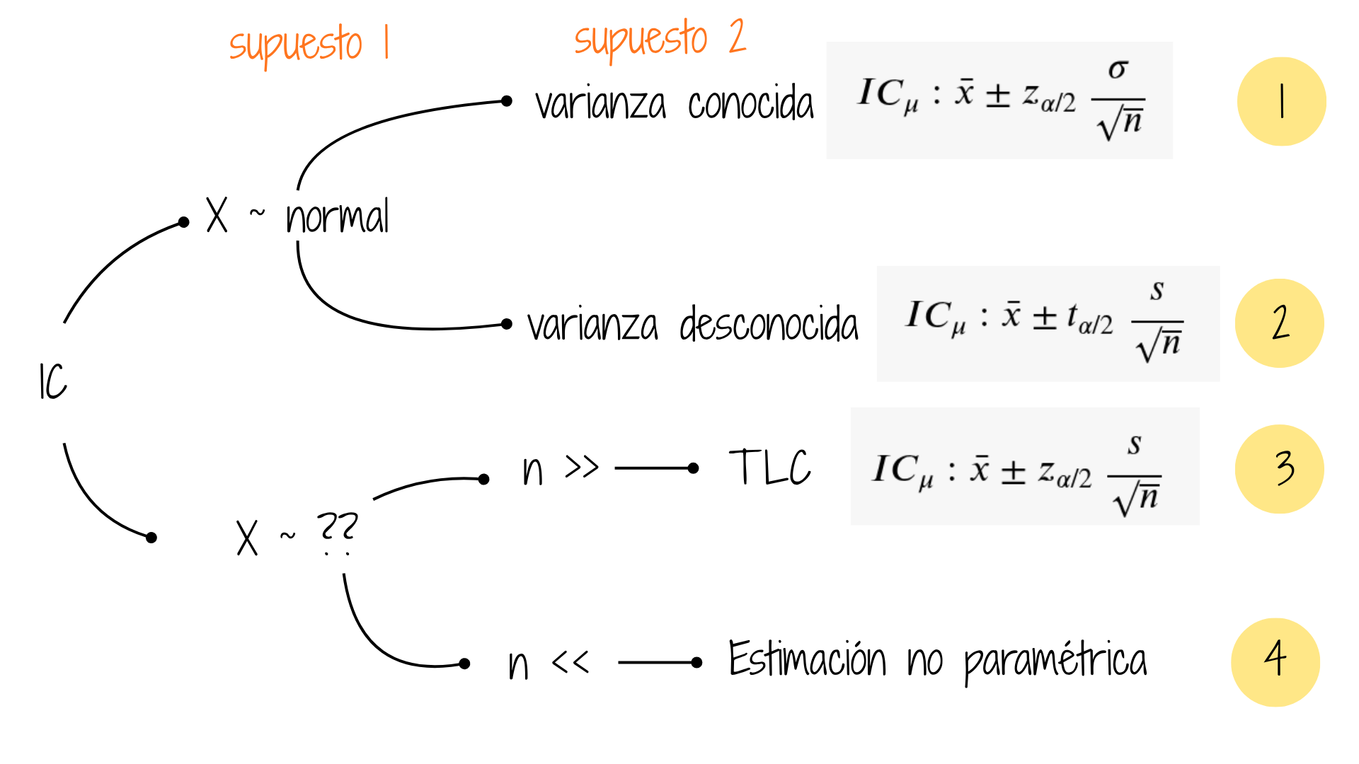 Un estimador por intervalo de confianza (IC) es una regla que especifica como usar las mediciones obtenidas en una muestra para calcular dos números que forman los extremos del intervalo que confiamos contenga al parámetro de interés \(\theta\). Dependiendo del parámetro se utiliza en la construcción del IC las distribuciones muestrales: \(normal\) \(estándar\) (\(Z\)), \(t-Student\), \(\chi^{2}\) o \(F-Fisher\)